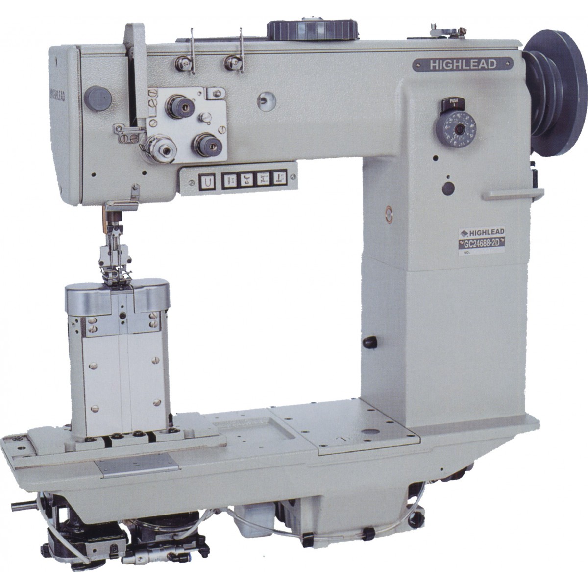 Stebnówka słupowa pochylona HIGHLEAD GC24688-2-D, 2-igłowa bez wyłączanych igieł (HEAVY DUTY) z pneumatyką, z transportem potrójnym igłowo stopkowo-ząbkowym.